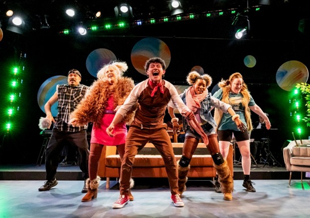 A photograph from the recent production of Marv Ross’ Marvin’s Rescue: Five actors on a brightly lit stage wearing colorful costumes, each sporting a bit of fur, here and there to convey that they are dogs, stand in a vee formation in front of a tan sofa.